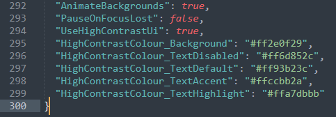 It’s also possible to set specific colours for the high contrast mode via the game’s settings file, if you want to use it to help with other sight conditions like colourblindness. This can be done by finding the setting file at ‘\AppData\Local\JuhrJuhr\Deep Space Exploitation\settings.json’, and changing the Hexadecimal colour values for the fields ‘HighContrastColour_Background’, ‘HighContrastColour_TextDisabled’, ‘HighContrastColour_TextDefault’, ‘HighContrastColour_TextAccent’, and ‘HighContrastColour_TextHighlight’, or as seen in the screenshot below.