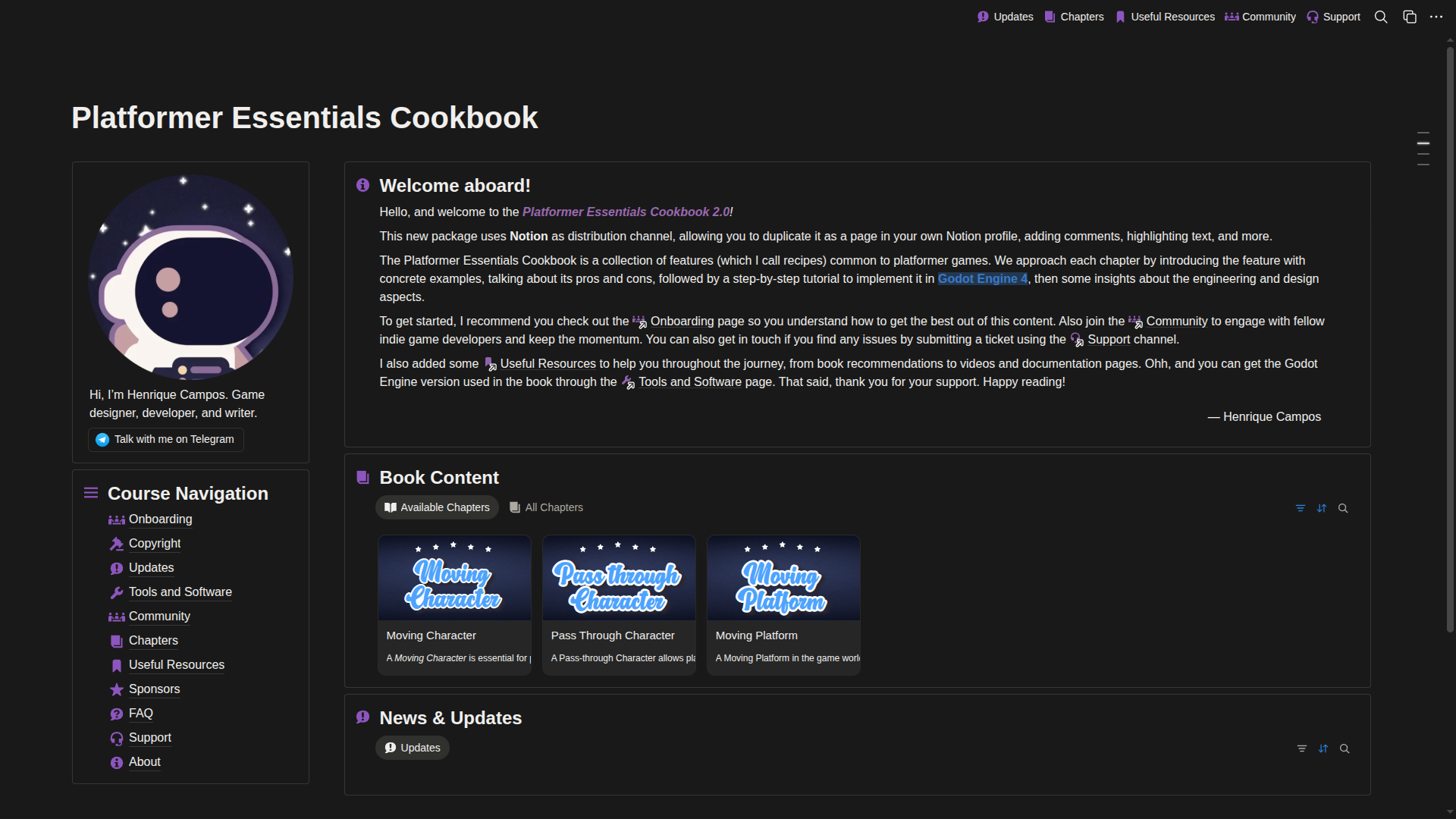 Using Notion as the distribution platform, I’ve completely reorganized and modernized the Platformer Essentials Cookbook. Here’s what you can expect: