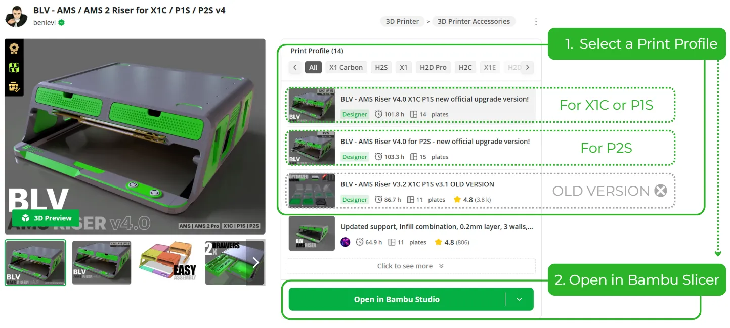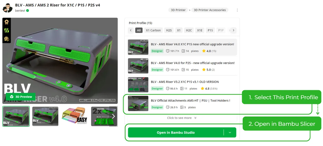The easiest and most reliable way to get perfect results right from the start is to use the dedicated print profiles I’ve prepared especially for you. Everything is already dialed in perfectly: supports, infill, strength settings, layer heights – you name it. All you have to do is open Bambu Studio, select your printer model, choose the colors you want for your BLV Riser, and hit print. That’s it – zero hassle, maximum quality!