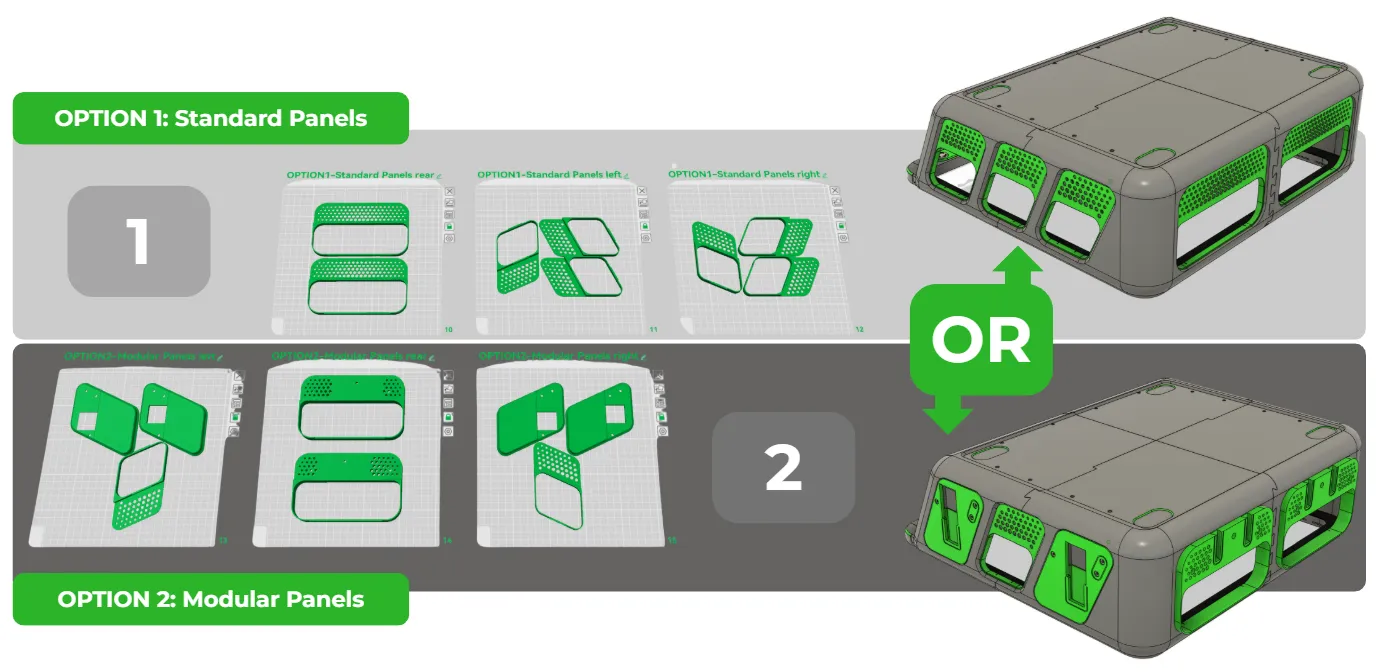 Panel Options Each profile includes two complete sets of side panels. You’ll see the name above each plate: OPTION1 or OPTION2. Feel free to print both sets and swap them whenever you want, or just print the one you prefer.
