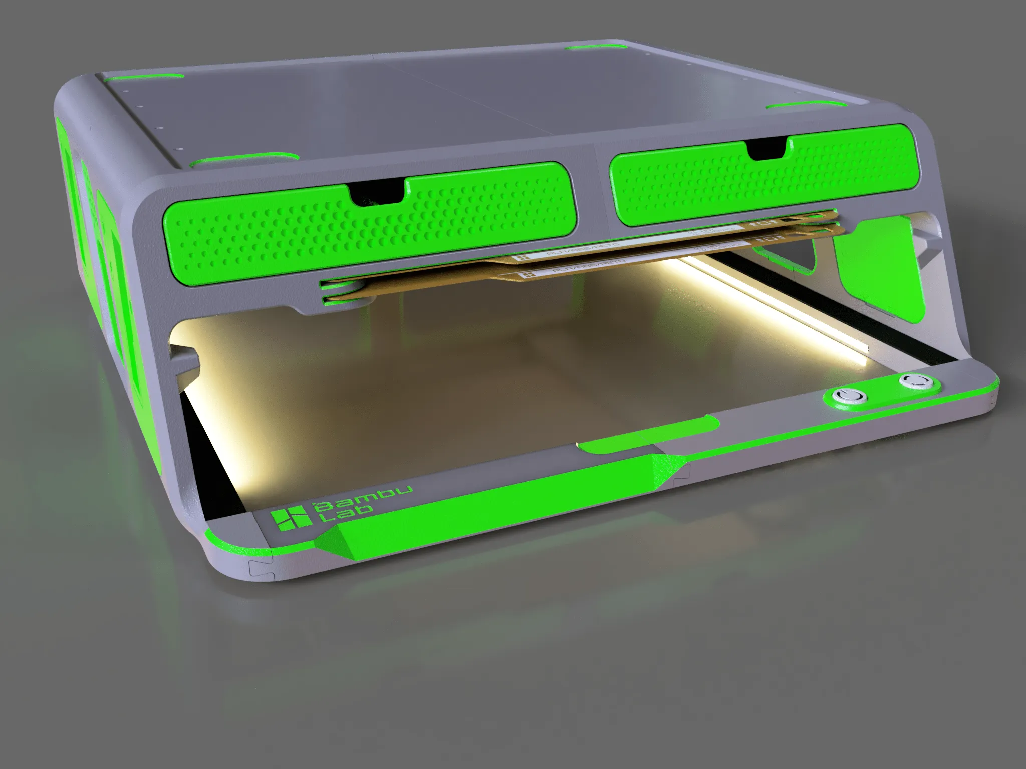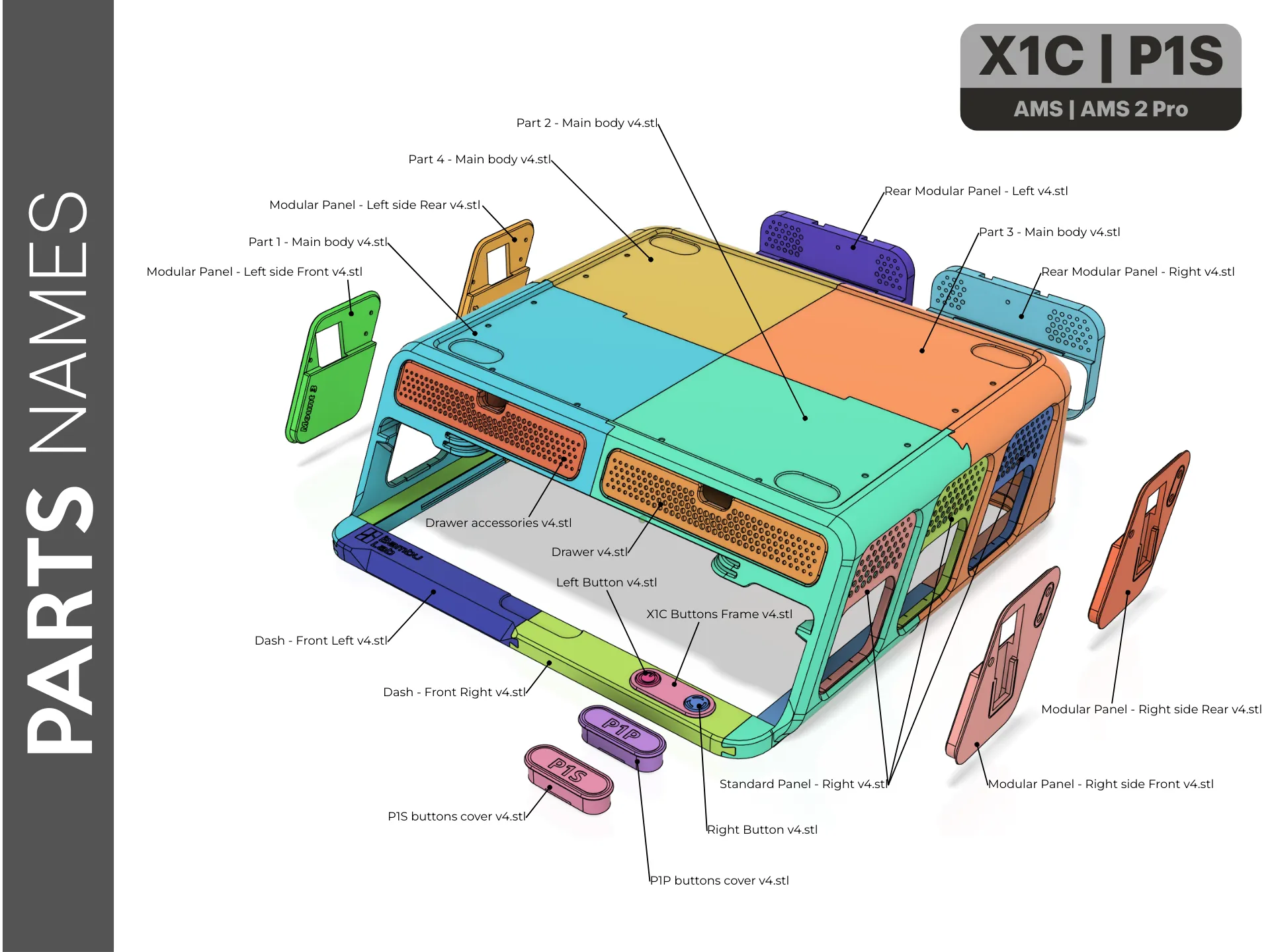 - 24/9/23 – Major update v1.2: faster printing, minimal supports, Added LED option, TPU gasket lock pins, stronger front/rear locking, Improved glass holder & deeper AMS leg sockets, New accessory drawer (fits hex keys, 2× hotends, cutters, wipers, screws, glue, needle), Optimized decorative panels + dedicated P1P/P1S button frames with logos