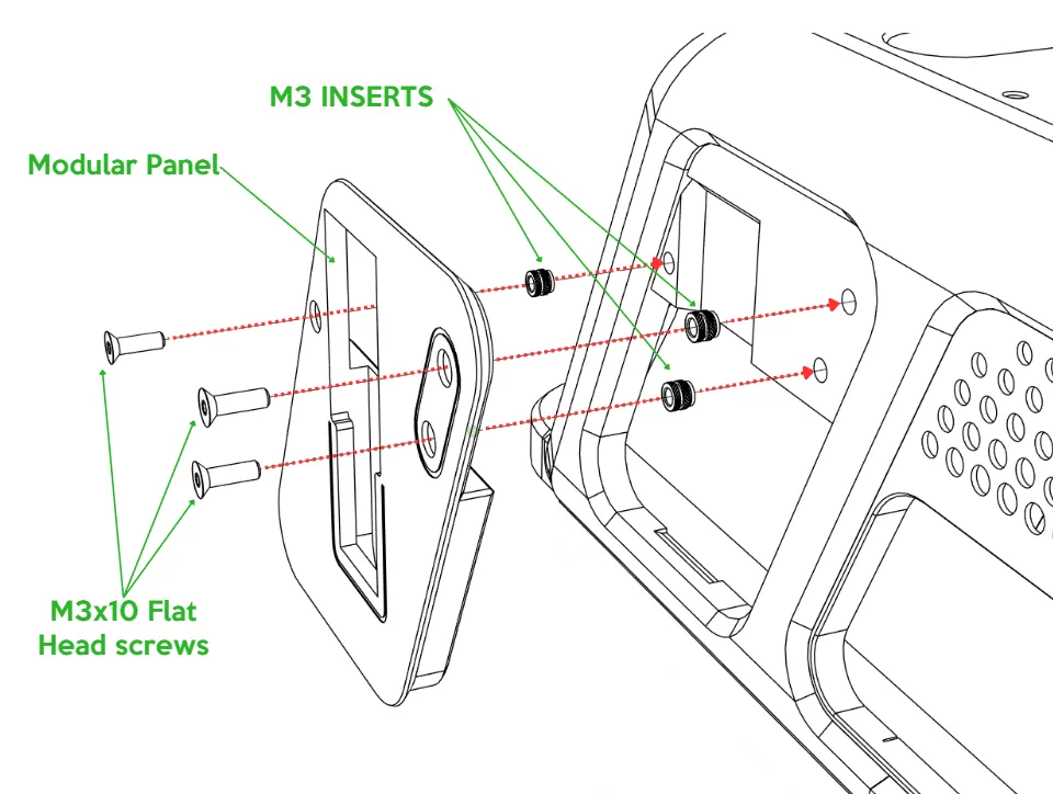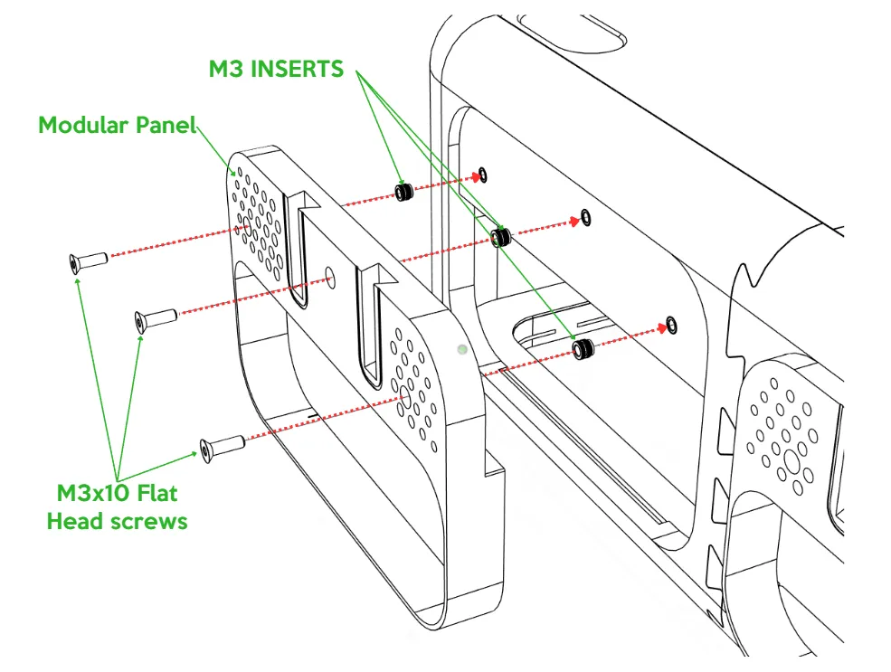 Secure each panel with 3× M3 × 10 mm flat-head screws.