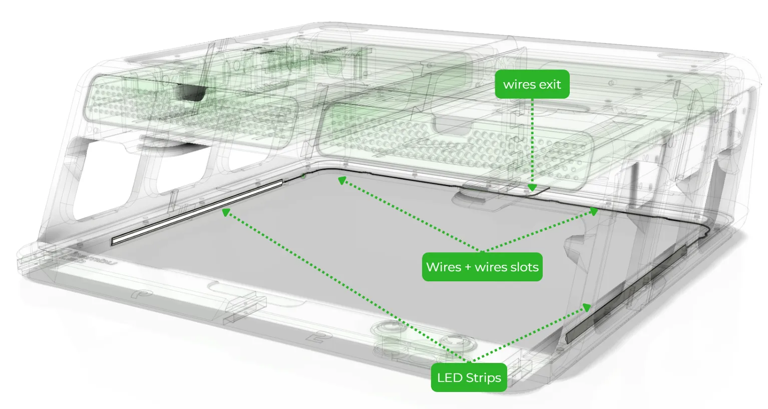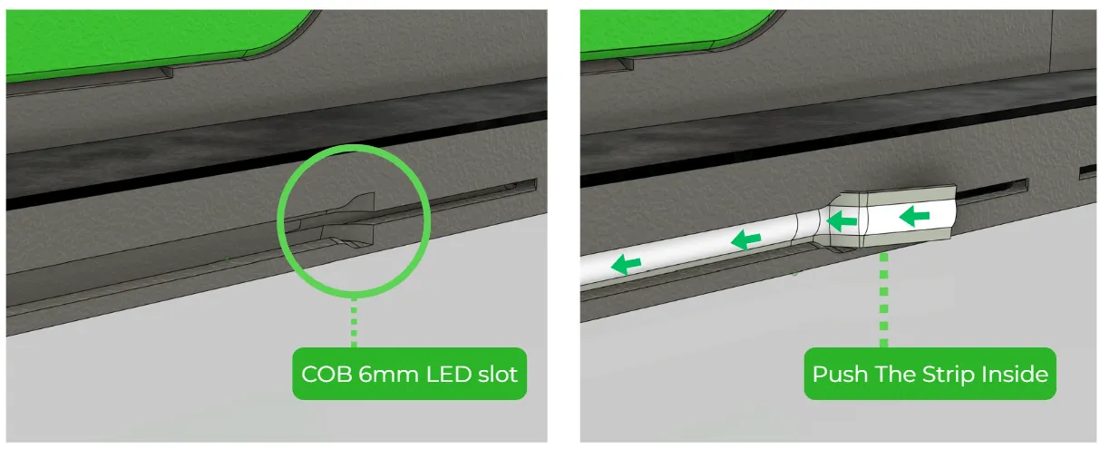 Please note that the Bambu LED strips are slightly wider. Therefore, they can only be used if inserted partially into the slot so that they sit at an angle (this is actually even better, as it prevents glare for the user). When using Bambu LED strips, you must remove the protective plastic film from the adhesive on the back of the strip so that it properly sticks to the edges.