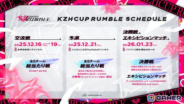 予選を2025年12月21日(日)に行い、決勝戦/エキシビションマッチは2026年1月23日(金)、パシフィコ横浜にて開催。予選を勝ち上がったチームのみが会場に参戦。決勝戦/エキシビションマッチは休憩を挟みつつ約4時間の実施を予定。大ボリュームで届けられる。エキシビションマッチはにじさんじライバー5名とストリーマー5名が対戦する。