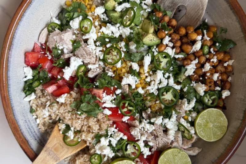 While late summer farmers’ markets are showing off, take advantage of the abundance of fresh tomatoes, corn, and peppers! This 15-minute protein bowl offers plenty of protein thanks to chicken and chickpeas, color and texture thanks to fresh veggies, and a punchy squeeze of lime that’ll have you craving it until the first chill in the air sends you reaching for soup instead. Find the recipe here.