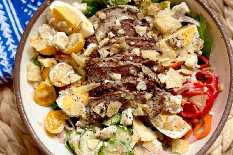 Fresh greens, juicy steak, a creamy balsamic that you’ll want to drizzle on everything … this salad has officially entered the weeknight rotation. The optional toppings (hello, pickled onions and kettle chips!) give it personality, and the whole thing comes together faster than you’d expect. Protein-packed and deeply satisfying, this one proves once again that a salad can absolutely be the main event. See recipe here.
