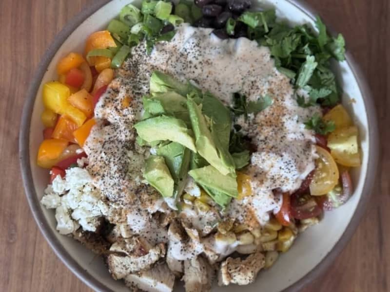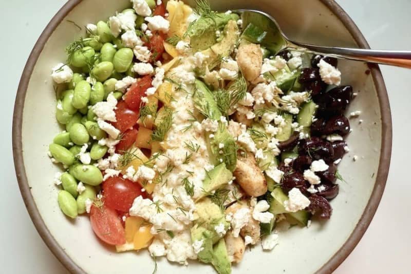 Ready in just five minutes (with prepped ingredients), this protein powerhouse delivers over 50g of protein under 500 calories. The secret? A clever combination of cottage cheese, chicken, and Mediterranean favorites like feta, edamame, and fresh vegetables. Perfect for meal prep, you can stock these ingredients weekly for the easiest healthy lunch ever. See recipe here.