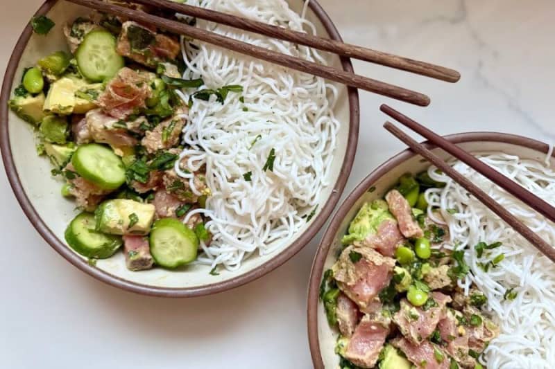 This tuna and bean salad is proof that quick lunches don’t have to mean boring ones. Cannellini beans (or chickpeas) add creaminess and plenty of fiber, while tuna keeps the protein count high. A few chopped pickles, a lighter hand with mayo, and a squeeze of lemon or pickle brine make it crave-worthy and fresh. It keeps well in the fridge for a couple of days, making it the perfect high-protein, fiber-rich meal prep option. Find the recipe here.