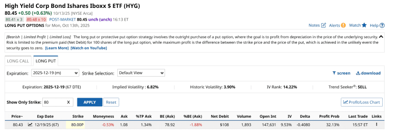 This is a trade, and while there’s a good chance nothing will happen between now and Dec. 19 with HYG, if it does, I am placing my chips on the table with it now. It cost me $108 per contract ($1.08 a share) to potentially profit if HYG drops below $80 during that time. It is just above that mark as of Monday’s close.