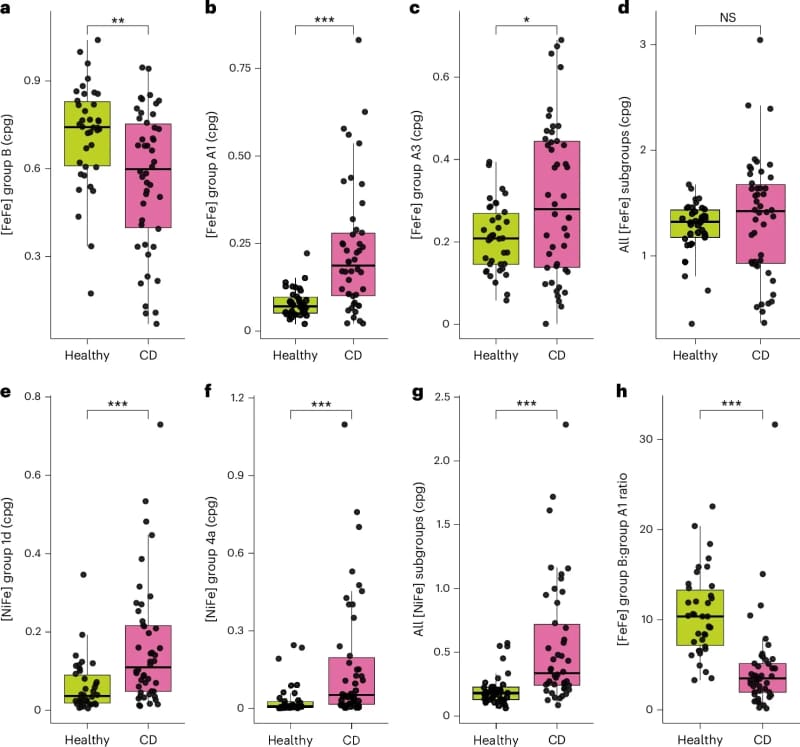 Comparison of hydrogenase gene levels in healthy individuals compared with individuals with Crohn’s disease in a case–control study. (CREDIT: Nature Microbiology)