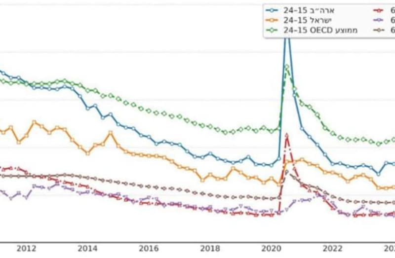 The data indicates that Israel’s once-high youth labor participation rates have now converged with the OECD average, after a steady decline over the past decade, beginning around 2017.