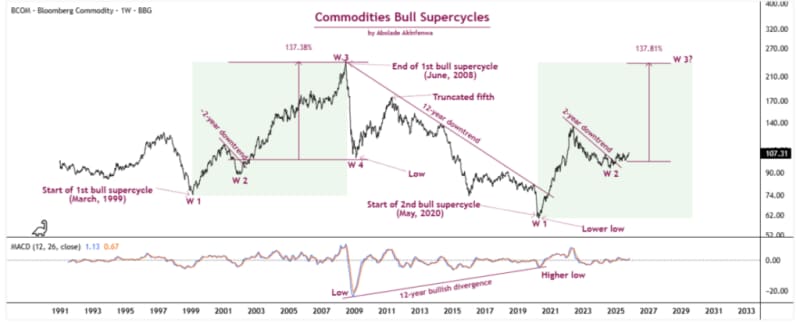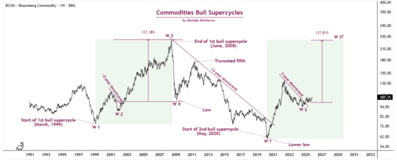 Then came the decisive shift. For the first time since 2008, BCOM broke above its 12-year descending resistance in December 2020. That breakout wasn’t just technical; it was symbolic. It confirmed that the long bear hibernation had ended and that a new secular bull supercycle had begun.