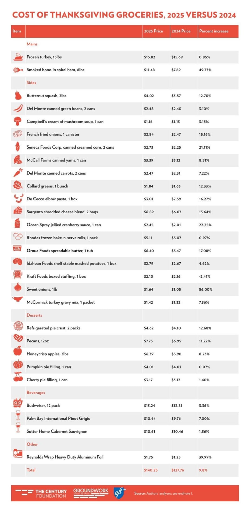 The report by Groundwork, the Century Foundation, and AFT is not the only one to examine the cost of Thanksgiving foods, which are often used as a shorthand for the state of inflation.