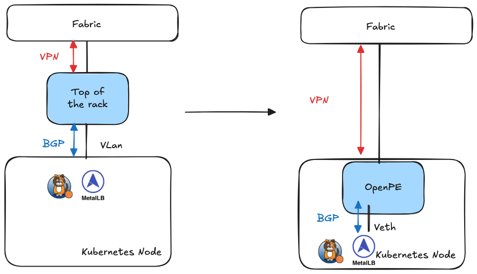 Integrating existing container networks with OpenPERouter is not overly complex. For BGP-based CNIs, establishing a BGP peer with OpenPERouter is required. For CNIs based on veth and bridges, the veth on the host side simply needs to be connected to the net namespace where OpenPERouter resides.
