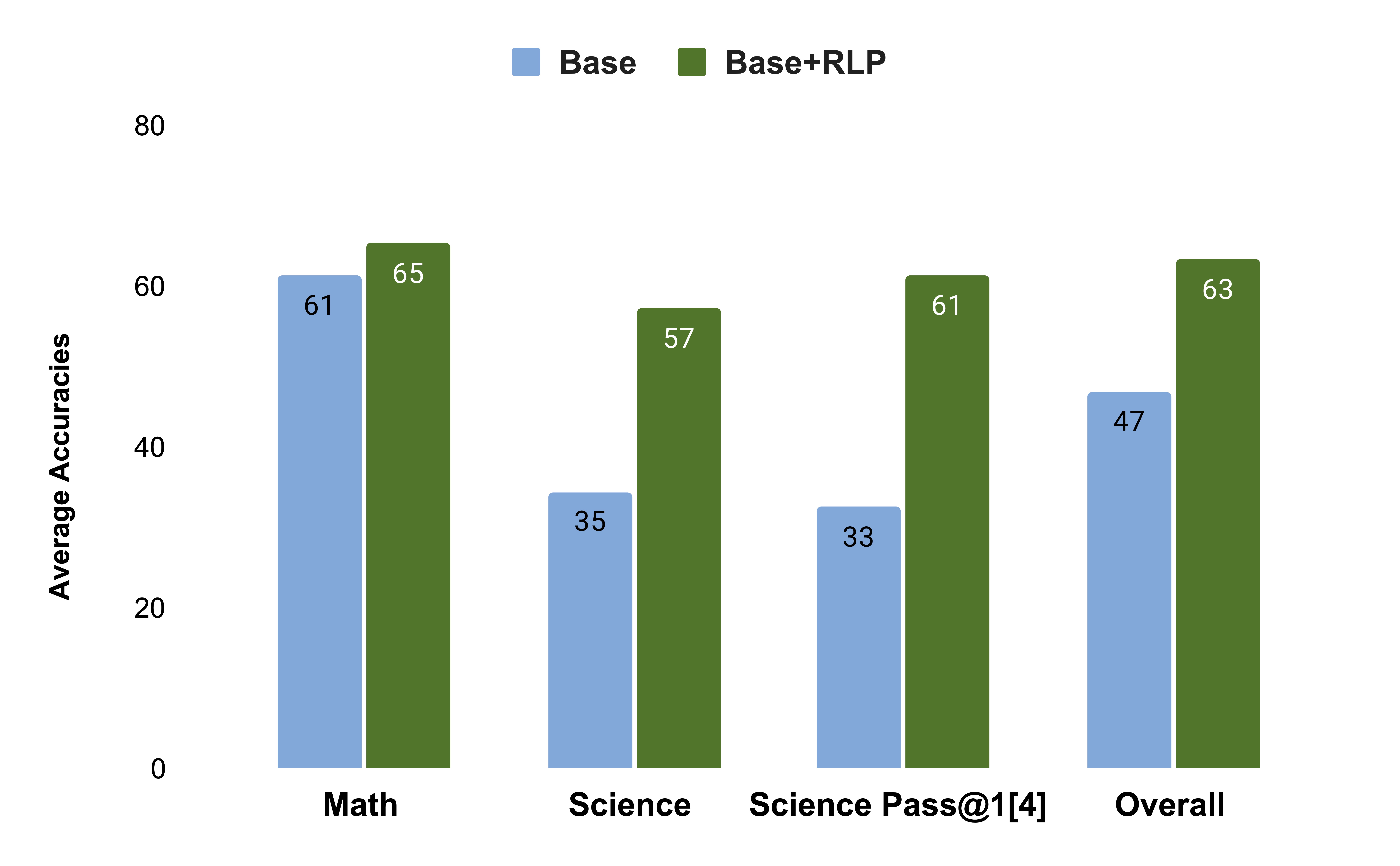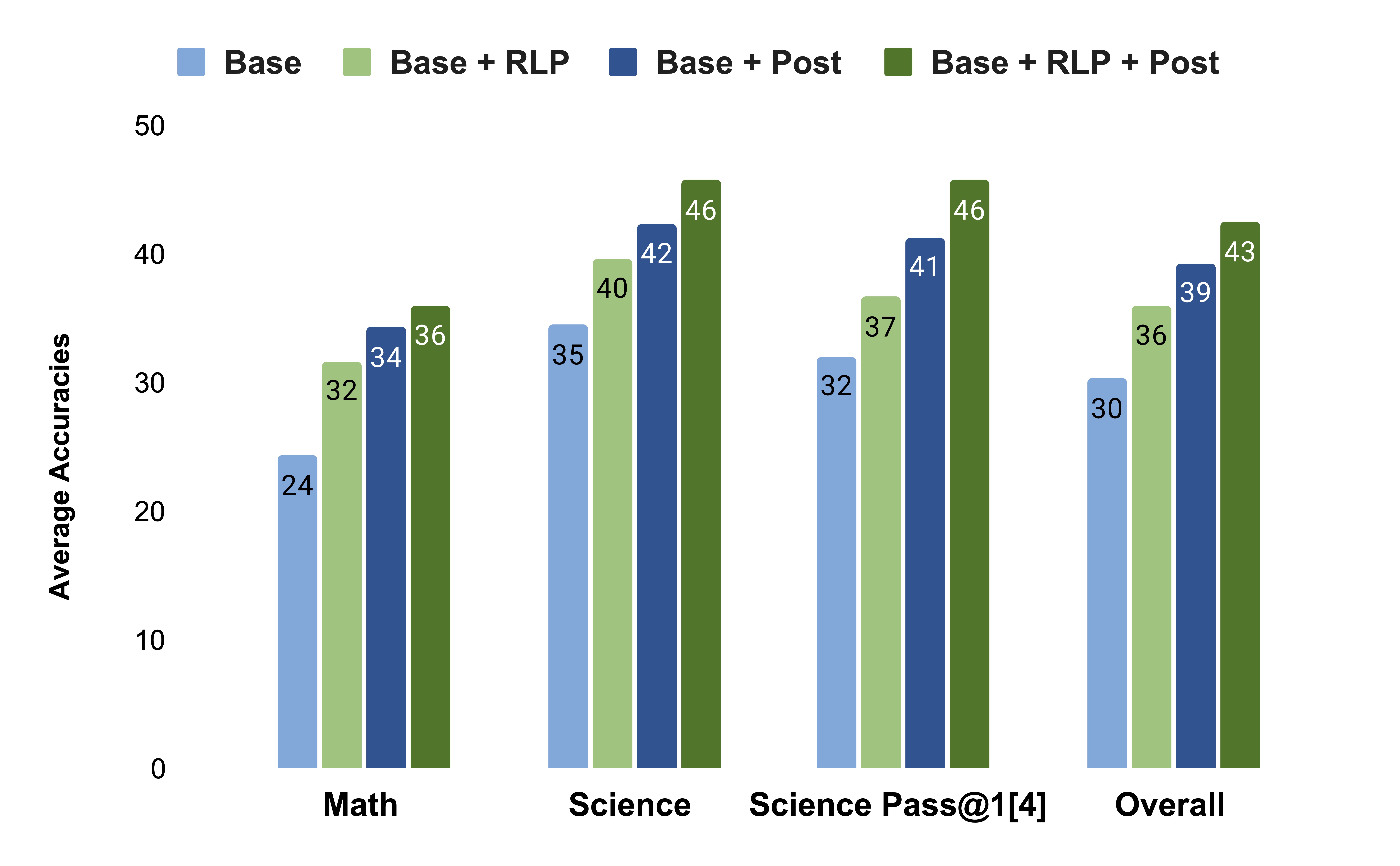 - Broad Generalization Beyond Math. RLP’s gains are not limited to a single domain. We observed particularly strong improvements in science benchmarks, where the RLP model achieved a +3 absolute point gain over the CPT model after post-training, showcasing its versatile, multi-step reasoning capabilities.