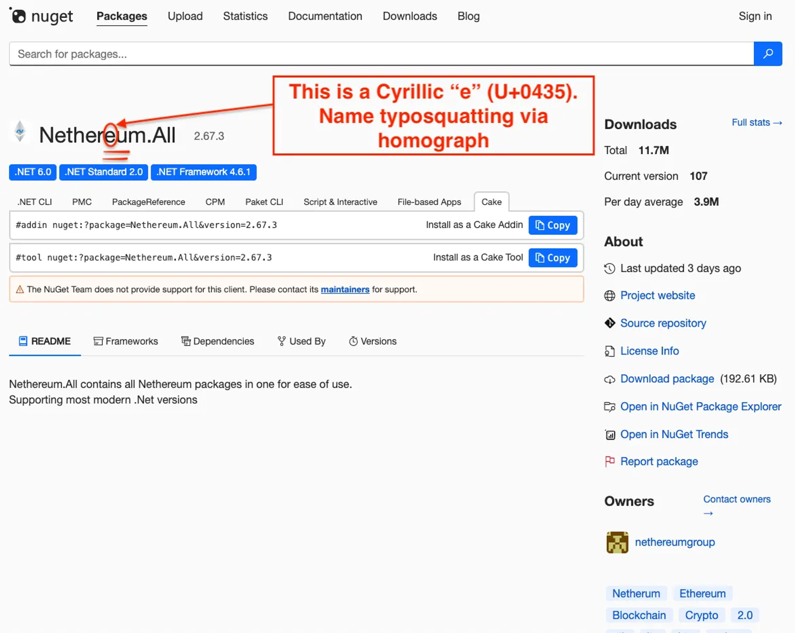 Now removed, the NuGet page for Netherеum.All uses a Cyrillic “e” (U+0435) to impersonate Nethereum, a homograph typosquat that looked identical in the title and in the copyable install commands.