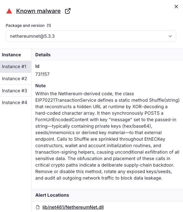 Socket’s AI scanner flagged the packages; manual analysis confirmed exfiltration. We reported the live sample on October 18, 2025; NuGet removed Netherеum.All and suspended the publisher on October 20, 2025. That leaves roughly four days of dwell time between publication and takedown, which is more than enough for damage if a victim passed mnemonics, private keys, keystore passwords, or signed transactions through the malicious path. Registry removal does not clean environments; treat exposed secrets as compromised and rotate them.