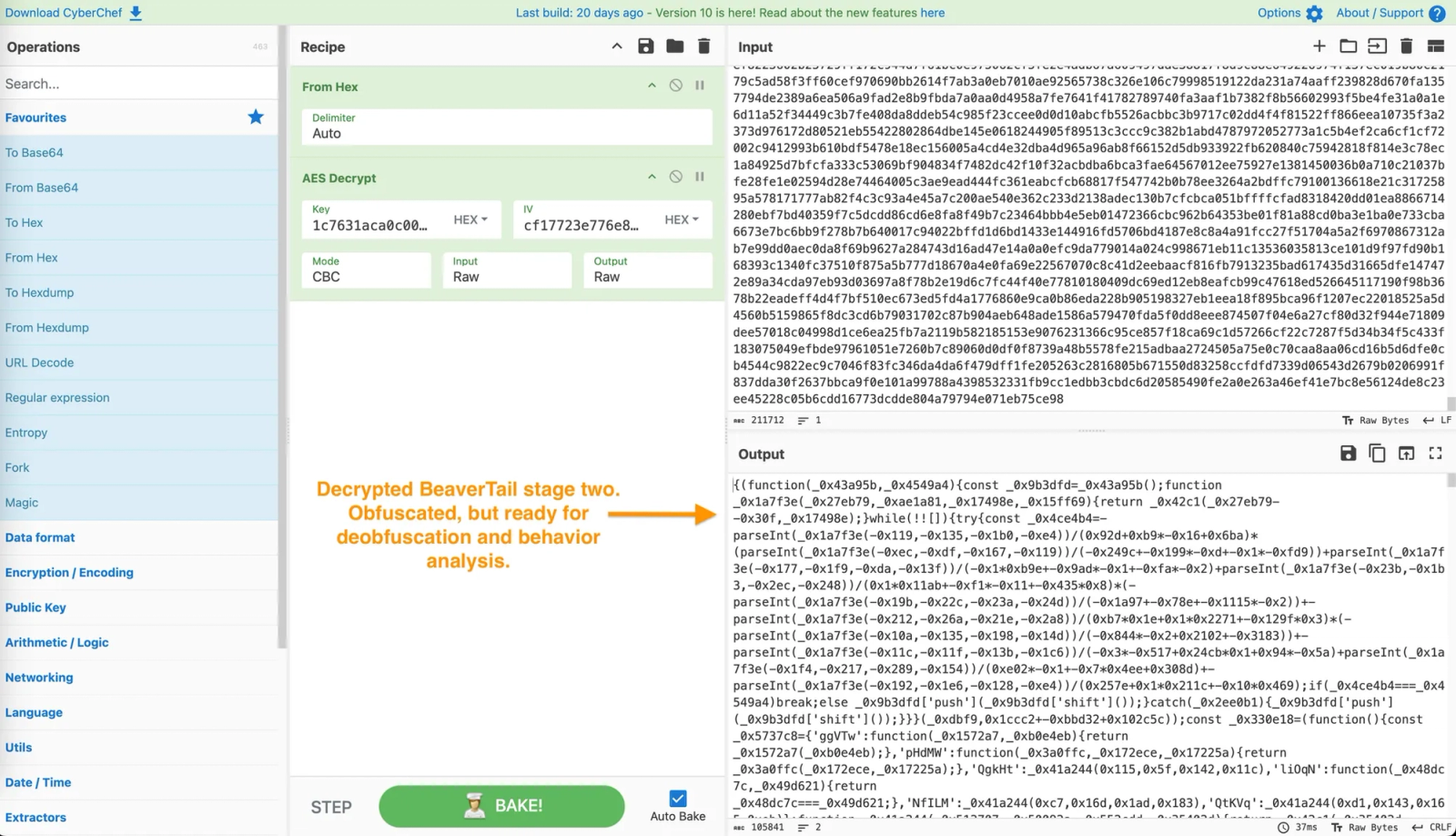 CyberChef reproduces the decrypt of the package’s encrypted loader. Converting the hex ciphertext and applying AES-256-CBC with the embedded key and IV recovers BeaverTail stage-two JavaScript in the Output pane, still obfuscated but ready for deobfuscation and behavior analysis.