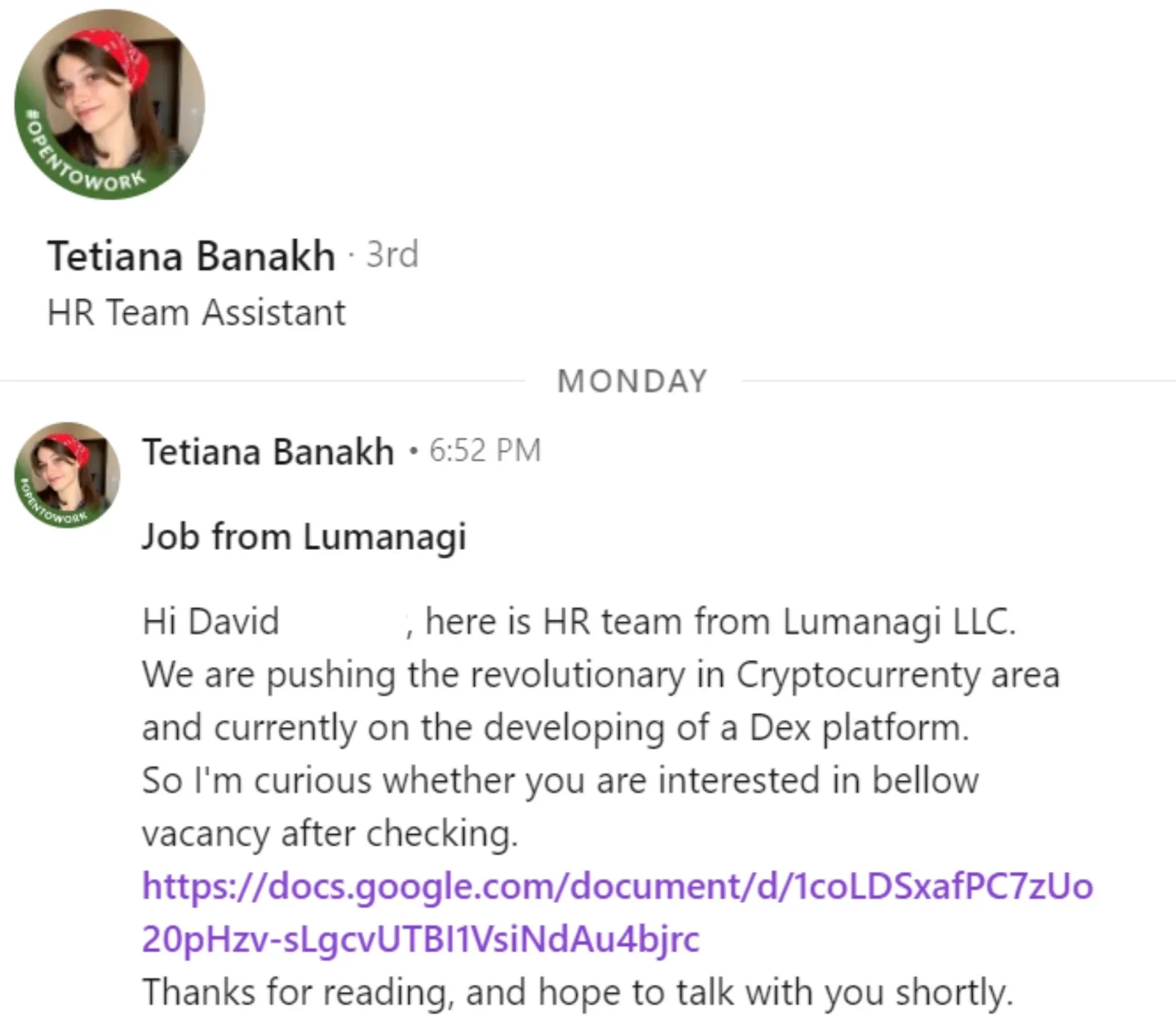 LinkedIn DM lure directing the target to a Google Docs link, a stage-one tactic that establishes a hiring pretext, pivots off-platform, and sets up delivery of a coding test with malicious dependency.