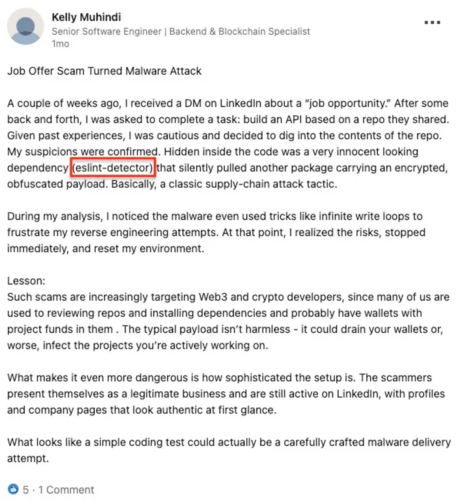 LinkedIn victim report of a job-offer lure that delivered a malicious npm package, eslint-detector, which silently fetched an encrypted payload, illustrating Contagious Interview reconnaissance and supply chain delivery tactics.
