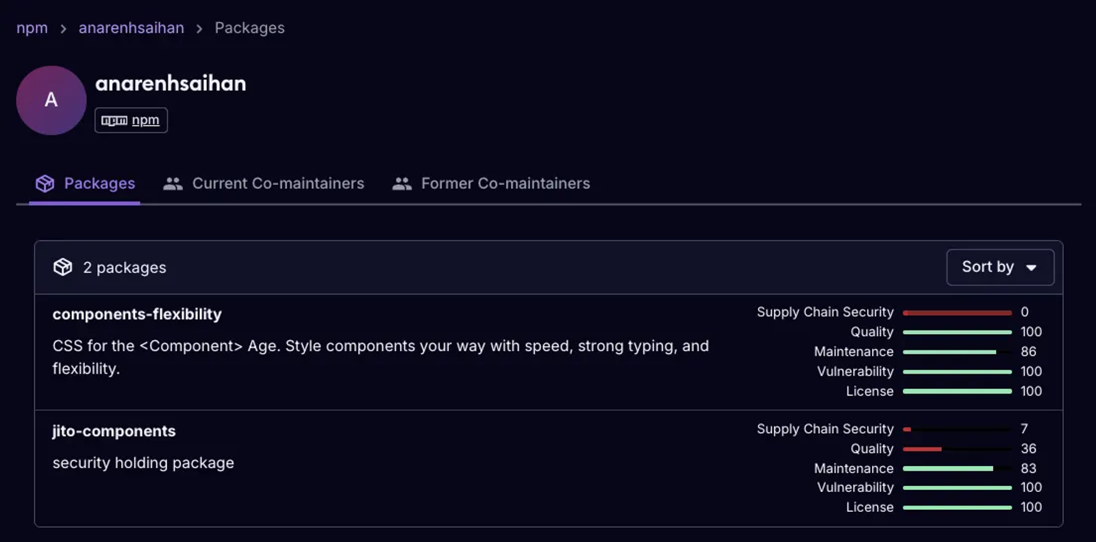 A note on the exploitation of npm registry mechanisms by Contagious Interview threat actors. In the current wave of the npm ecosystem infiltrations, we found cases highlighting some gaps in account-level enforcement on the npm registry that threat actors are targeting for abuse. For example, the threat actors’ alias anarenhsaihan published two malicious packages: jito-components, which has since been removed and replaced by a security holding page, and components-flexibility, which remains live at the time of writing. Both packages serve as loaders for the BeaverTail malware.
