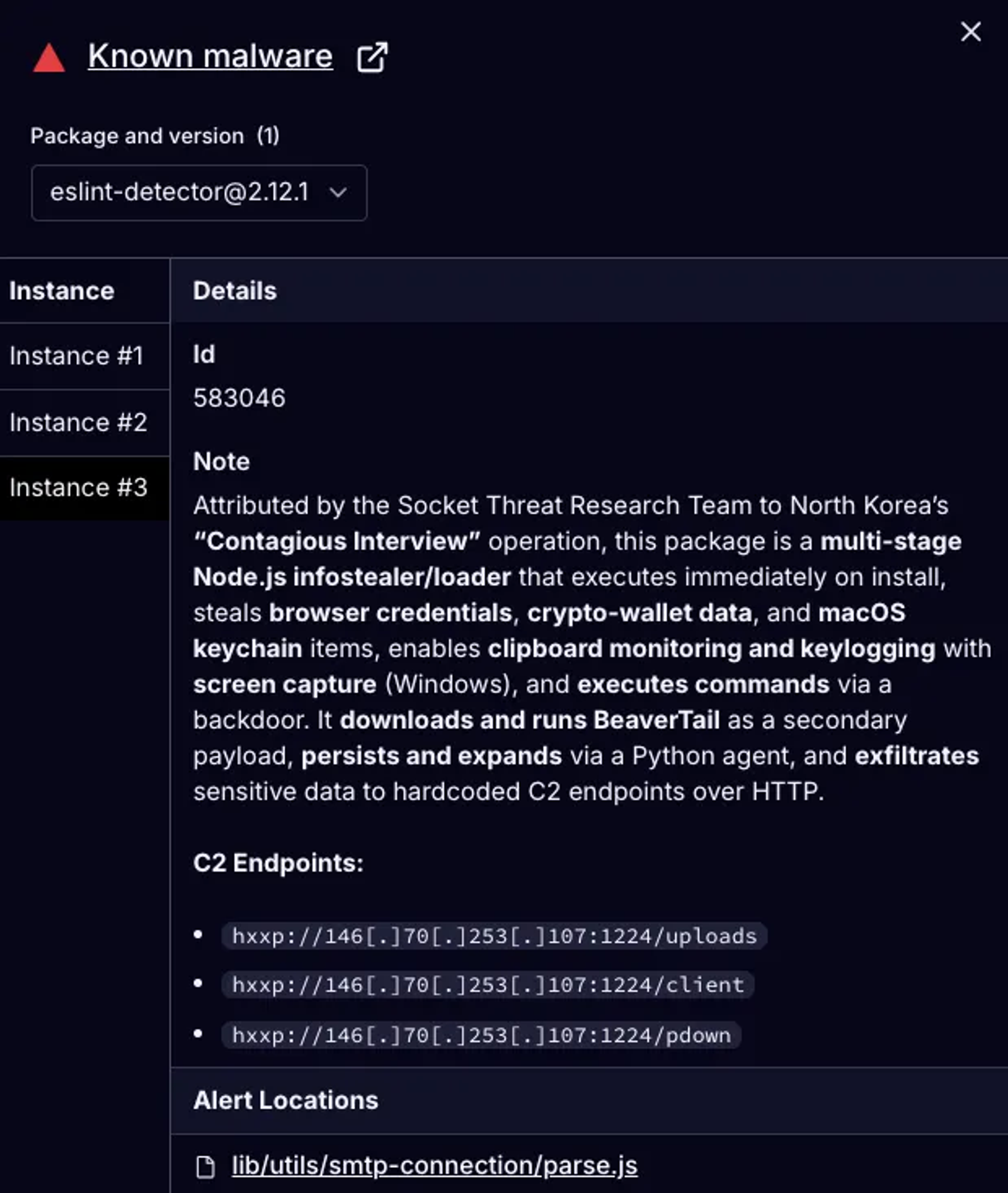 Socket AI Scanner’s analysis of the malicious eslint-detector package highlights install-time execution of a multi-stage infostealer/loader, theft of browser credentials and crypto-wallet data, macOS Keychain access, clipboard monitoring and Windows keylogging with screen capture, remote command execution, BeaverTail download with Python-based persistence (i.e. InvisibleFerret staging), and HTTP exfiltration to hardcoded C2 endpoints.