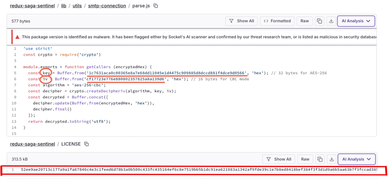 Socket AI Scanner’s analysis of the malicious redux-saga-sentinel package highlights an encrypted loader split across two files. The top file, lib/utils/smtp-connection/parse.js, imports Node crypto and hardcodes an AES-256-CBC key and IV. The bottom file, LICENSE, stores the large hex ciphertext. At runtime, parse.js decrypts the LICENSE blob to plaintext JavaScript and executes it, enabling in-memory loader execution within the same package.