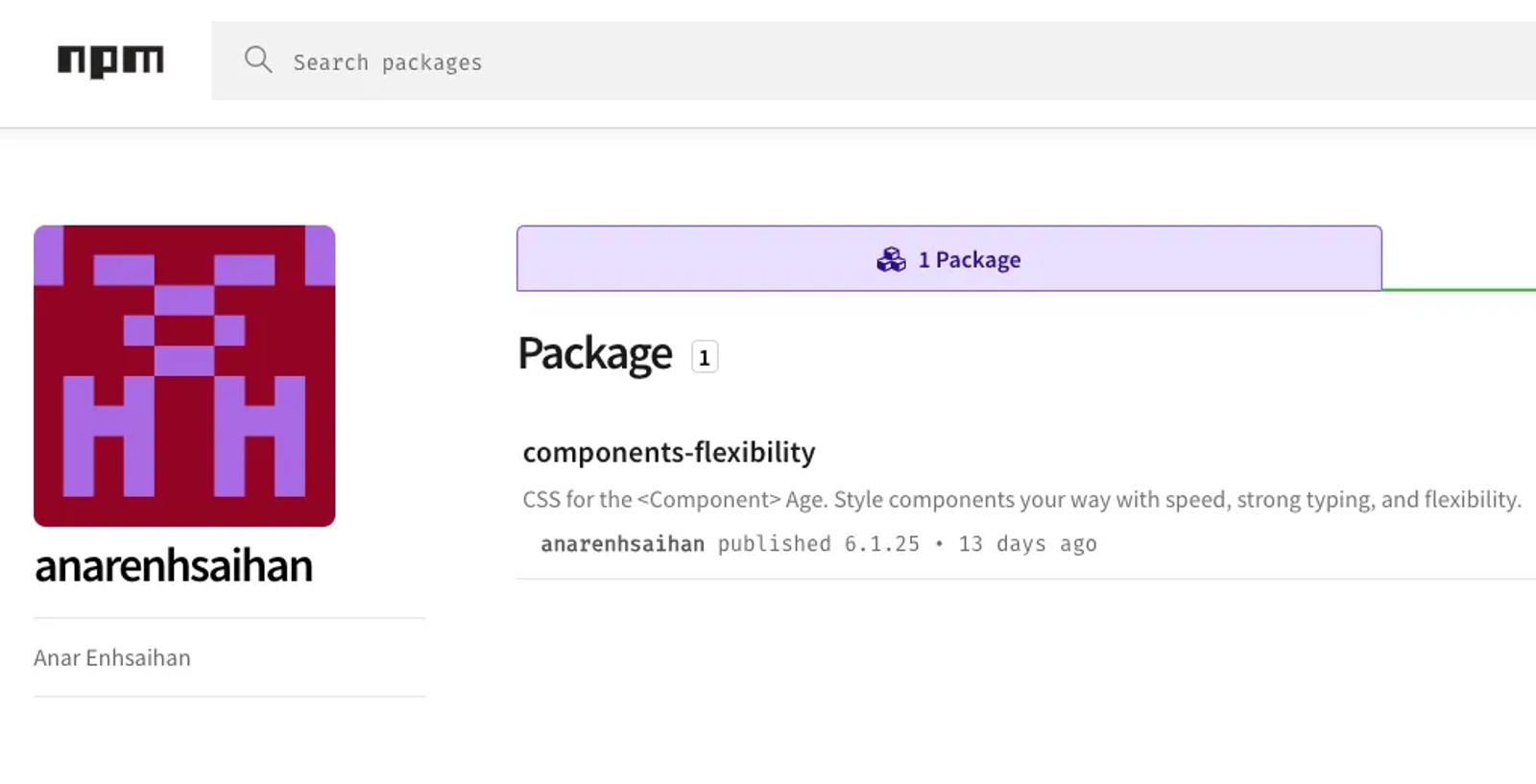npm account anarenhsaihan with a live package, components-flexibility, indicating the alias remains active and able to publish after the jito-components takedown.
