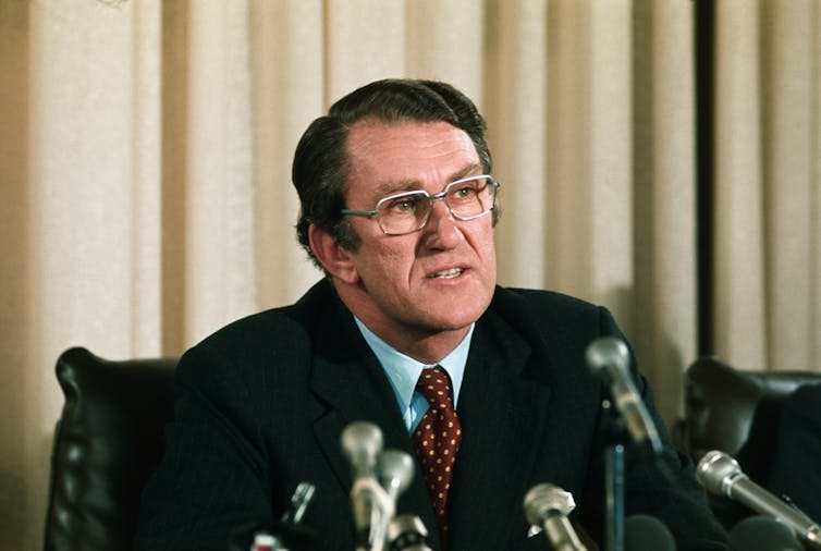 Malcolm Fraser at a press conference in Sydney, 1975. Getty Images
