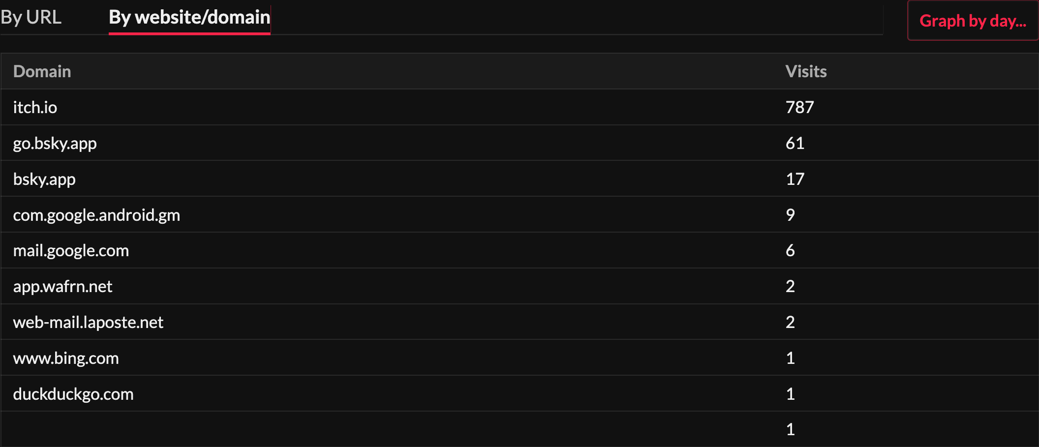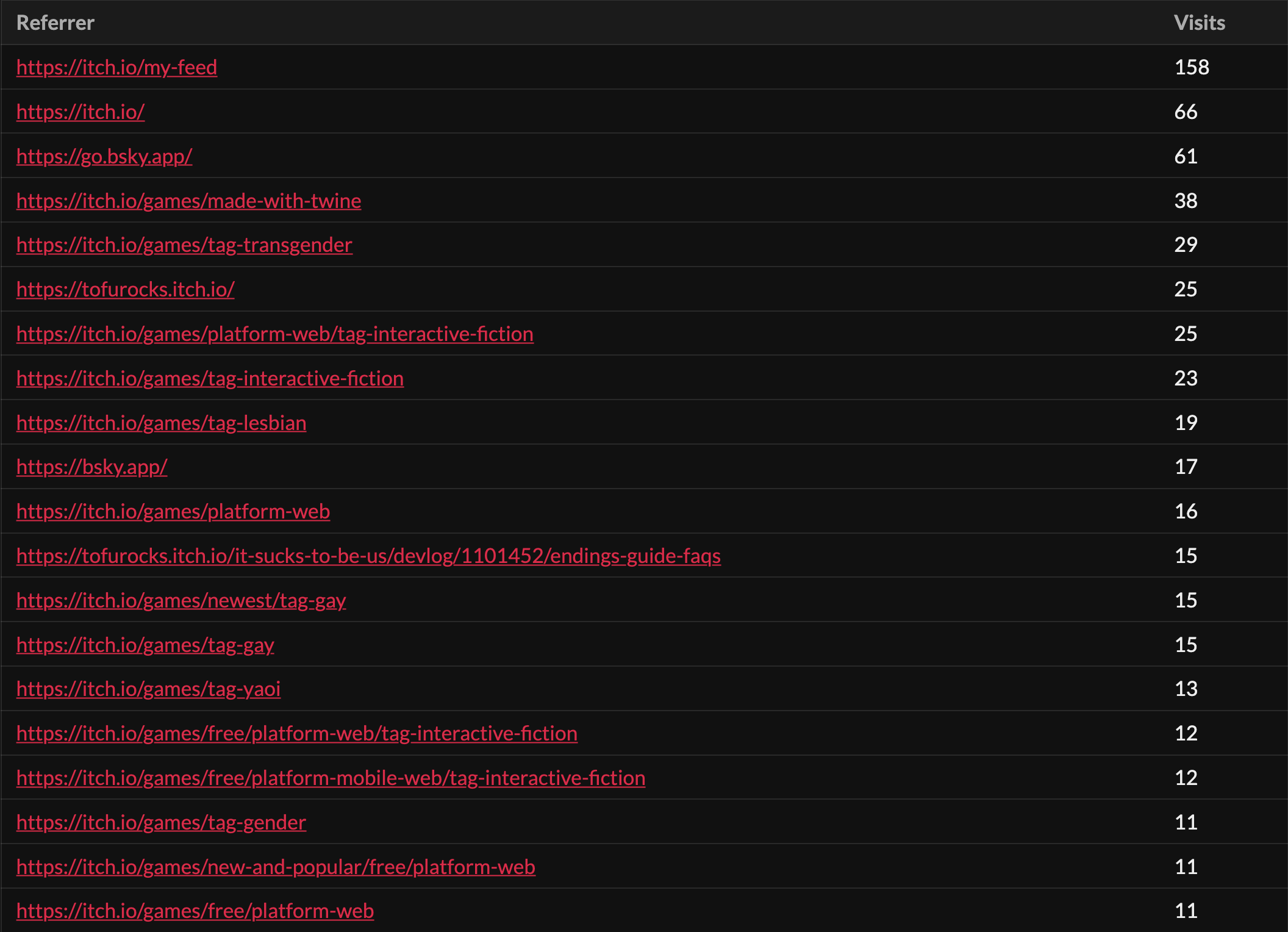 When we look at the website/domain referral stats, internal traffic is unparalleled. Clickthroughs on Bluesky barely hold a candle to it, and the other referrals are likely from folks who received either my newsletter or an email from itch.io about the release or a devlog. I dunno, I don’t have much else to say about this one.