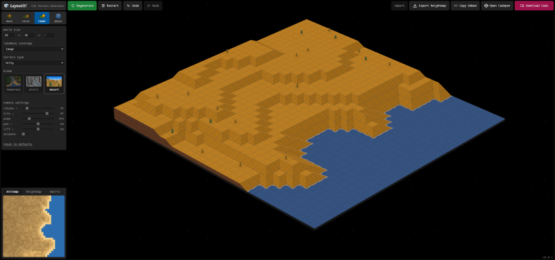 On the user side, two main knobs are exposed: landmass coverage, which controls the percentage of water that fills the map, and terrain type, which sets the ceiling for elevation in the scene.