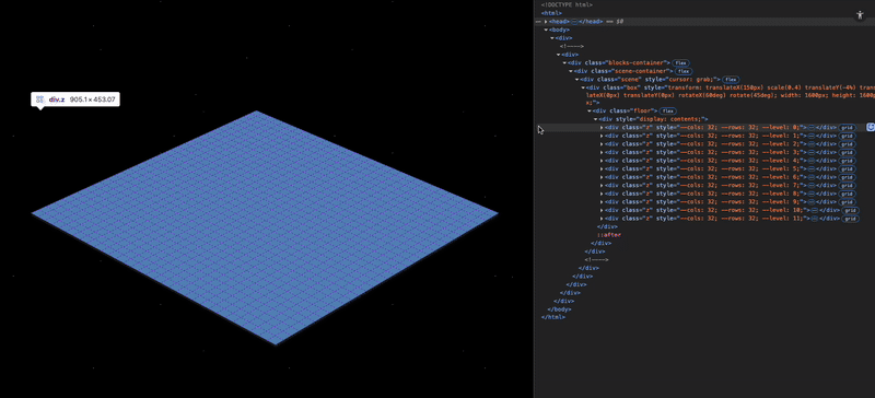 The .floor element defines the world’s tilt. By applying transform: rotateX(65deg) rotate(45deg), we angle the entire space into view, establishing the camera’s orientation. On top of this base, multiple .z elements are stacked vertically with translateZ(25px * level). That way, each layer acts as a grid slice at a specific height (a unique Z level) while the rows and columns define the X and Y coordinates.