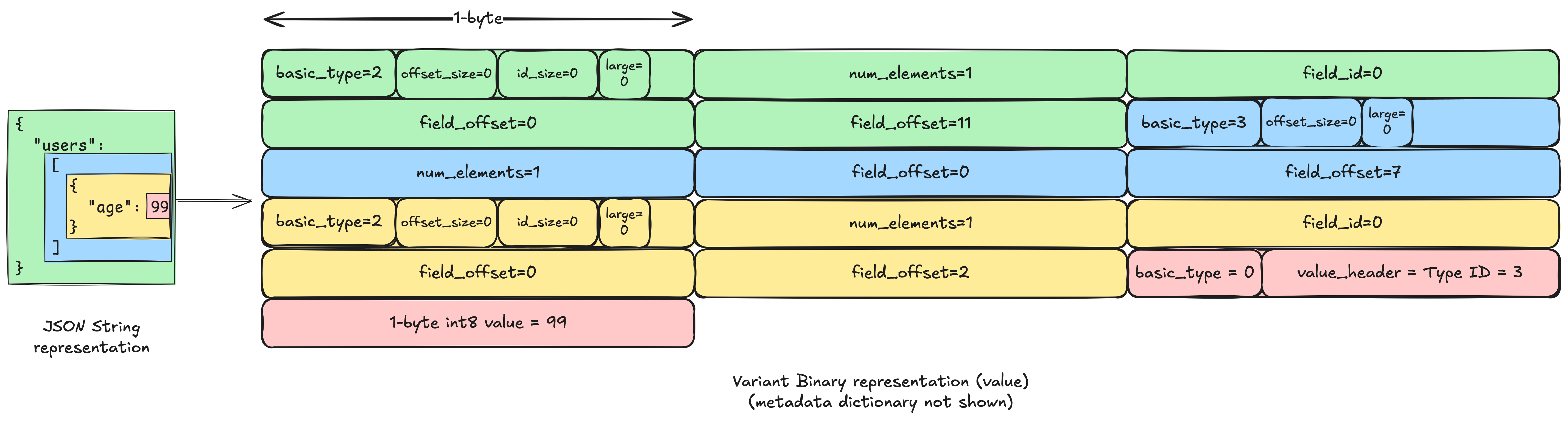 The remarkable performance of the VARIANT data type comes from a highly optimized binary encoding format in the underlying Parquet files. The open specification for VARIANT defines its physical representation in Parquet as a struct with two binary fields: metadata and value. They form a compressed, self-describing, query-optimized format.