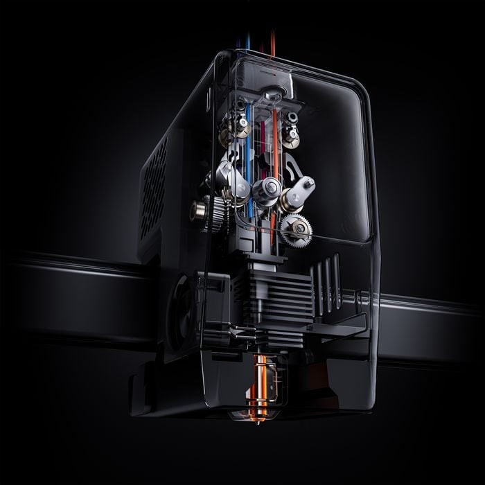 The extrusion system on the Kobra X is wildly different from prior models. Instead of accepting a single filament, as most FFF systems do, it can accept FOUR filaments at once.