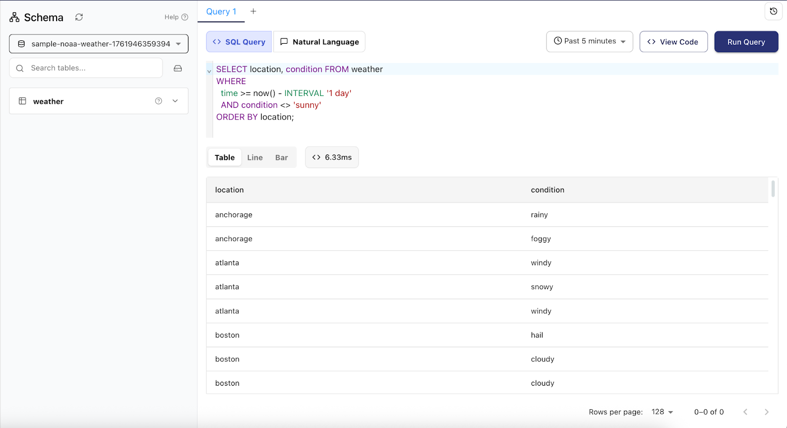Once data is written, it’s time to query. Navigate to “Query Data” -> “Data Explorer” on the left menu of the UI, select the schema you loaded data into from the dropdown, and then you can start querying. To explore the schema, you can start with something simple, such as querying all records from within the past day: