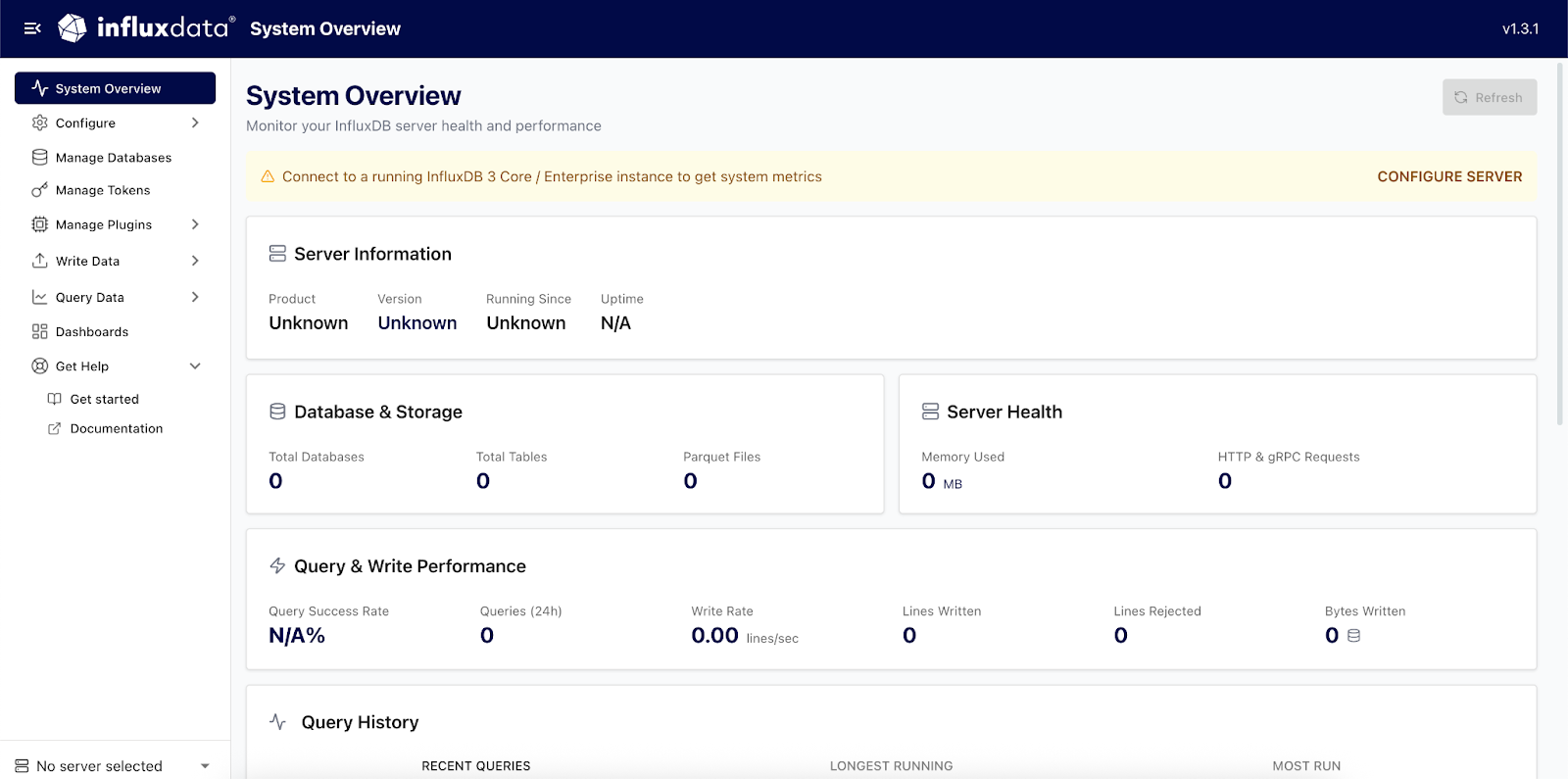 Once you fill out all the fields, click “Add Server.” When you navigate back to System Overview in the UI, you should see that you’re connected to the server that you’re running on the machine. Your UI is up and running, so it’s time to write data.