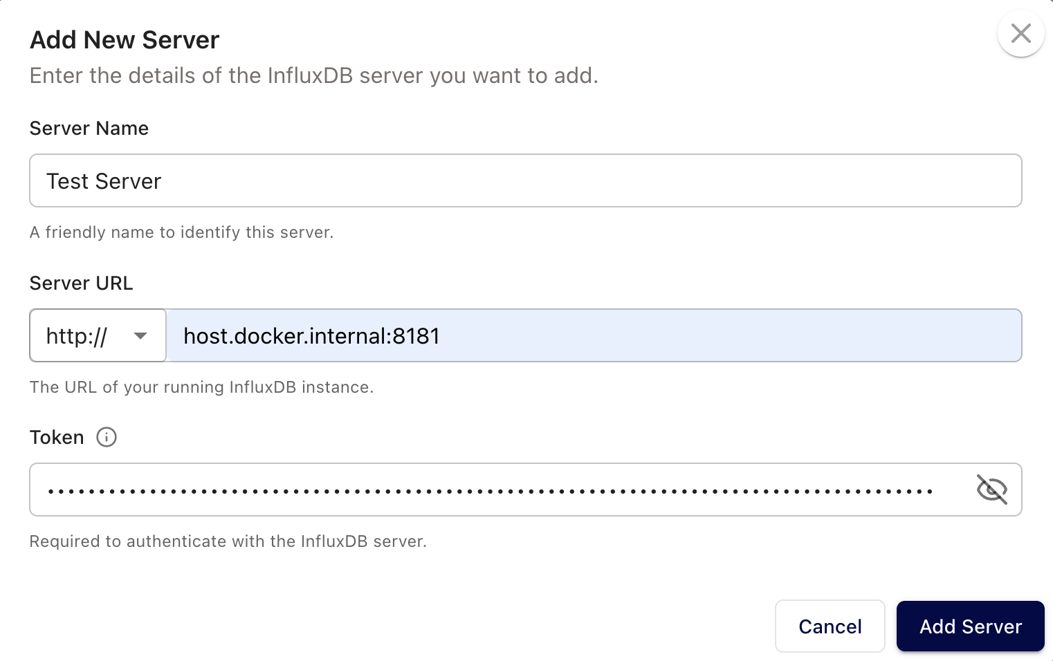 Click on “configure server” towards the top right, then click on “connect your first server.” Enter a name of your choosing for your server (e.g., “Test Server”). Enter either localhost:8181 or host.docker.internal:8181 for your server URL, depending on whether you used the simple download or Docker container. Then enter the admin token you generated and copied earlier as your token, which should start with apiv3_.
