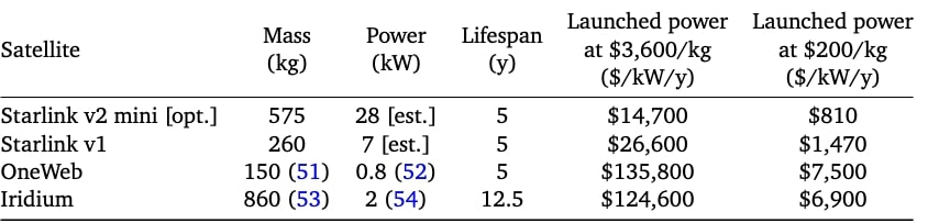 Google researchers estimate SpaceX Starlink V2 mini as having 28 kilowatts of space solar power. The new v2 mini satellites weigh 575kg. Exact specifications have not been publicly released by SpaceX, but photometric and other analyses yield solar panel area ∼105 square meters. Assuming 22% solar panel efficiency, 1.361kW/m2 solar insolation and 90% packing area for square cells they obtain ∼28kW/satellite.