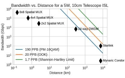 The ISC order of 10 Tbps is achievable by using Commercial Off-The-Shelf (COTS) Dense Wavelength Division Multiplexing (DWDM) transceiver technology, similar to that used in terrestrial data centers. The primary challenge is that such equipment requires significantly higher received optical power levels, on the order of hundreds of microwatts, compared to the ∼1 μW levels typical for traditional long-range ISLs. These power levels can be achieved by drastically reducing the inter-satellite distance. Since for distances larger than the Fresnel limit, received power scales with the inverse square of the distance due to beam divergence, flying the satellites in close formation (hundreds of kilometers, or less) provides ample power to close the link budget for high bandwidth COTS transceiver.