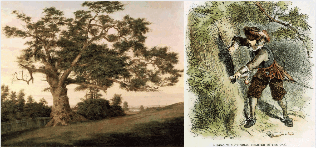 Left, “The Charter Oak,” oil on canvas, Charles De Wolf Brownell, 1857, located in the Wadsworth Atheneum Museum of Art. Right, “Hiding the original charter in the Oak.” The original royal charter of Connecticut was hidden in the trunk of a nearby large white oak tree in 1687, to hide it from agents of King James. Undated (likely 19th century) woodcut. (Wikipedia)