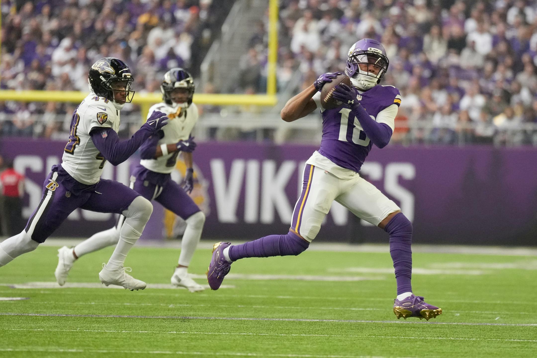 Vikings wide receiver Justin Jefferson (18) makes a 10-yard gain in their opening drive against the Ravens He had only four catches on 12 targets. (Jerry Holt/The Minnesota Star Tribune)