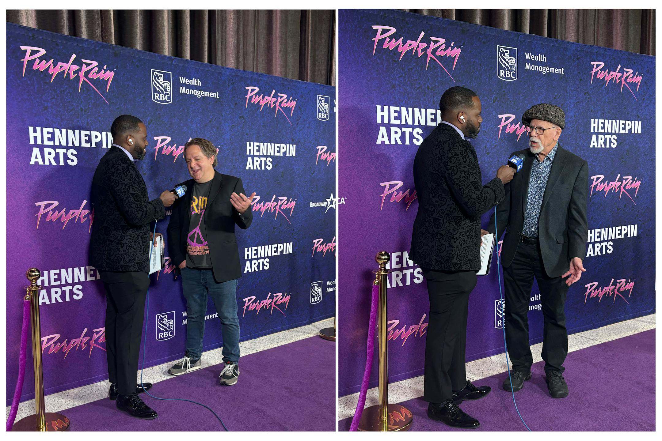 Star Tribune critics Chris Riemenschneider, left, and Jon Bream, right, get interviewed at the pre-Broadway debut of the musical “Purple Rain” at The State Theatre in Minneapolis Wednesday night. (Abby Sliva)