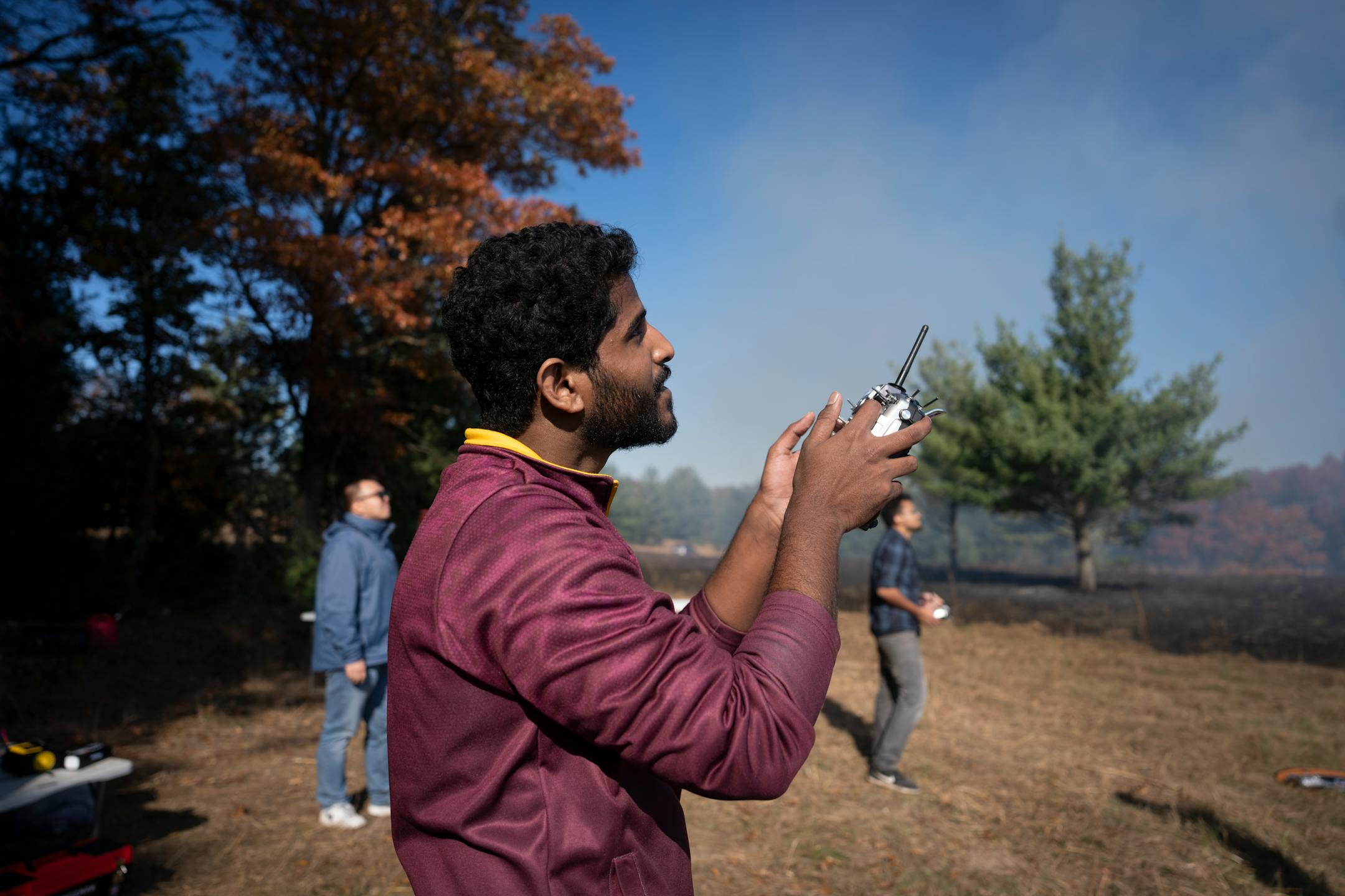 University of Minnesota researchers, including Nikil Krishnakumar, use remotes to fly drones in the smoke of the prescribed burn. (Renée Jones Schneider/The Minnesota Star Tribune)