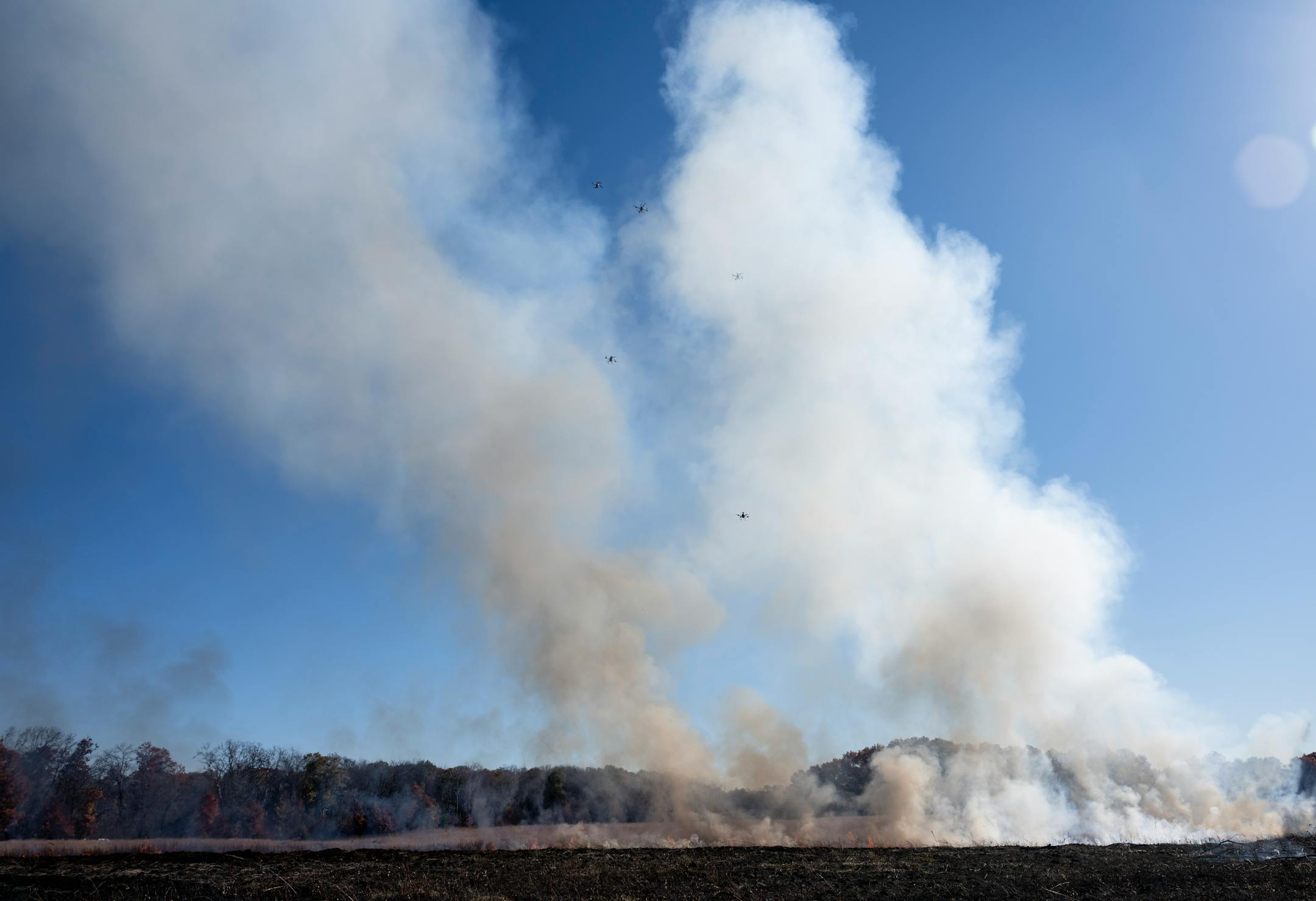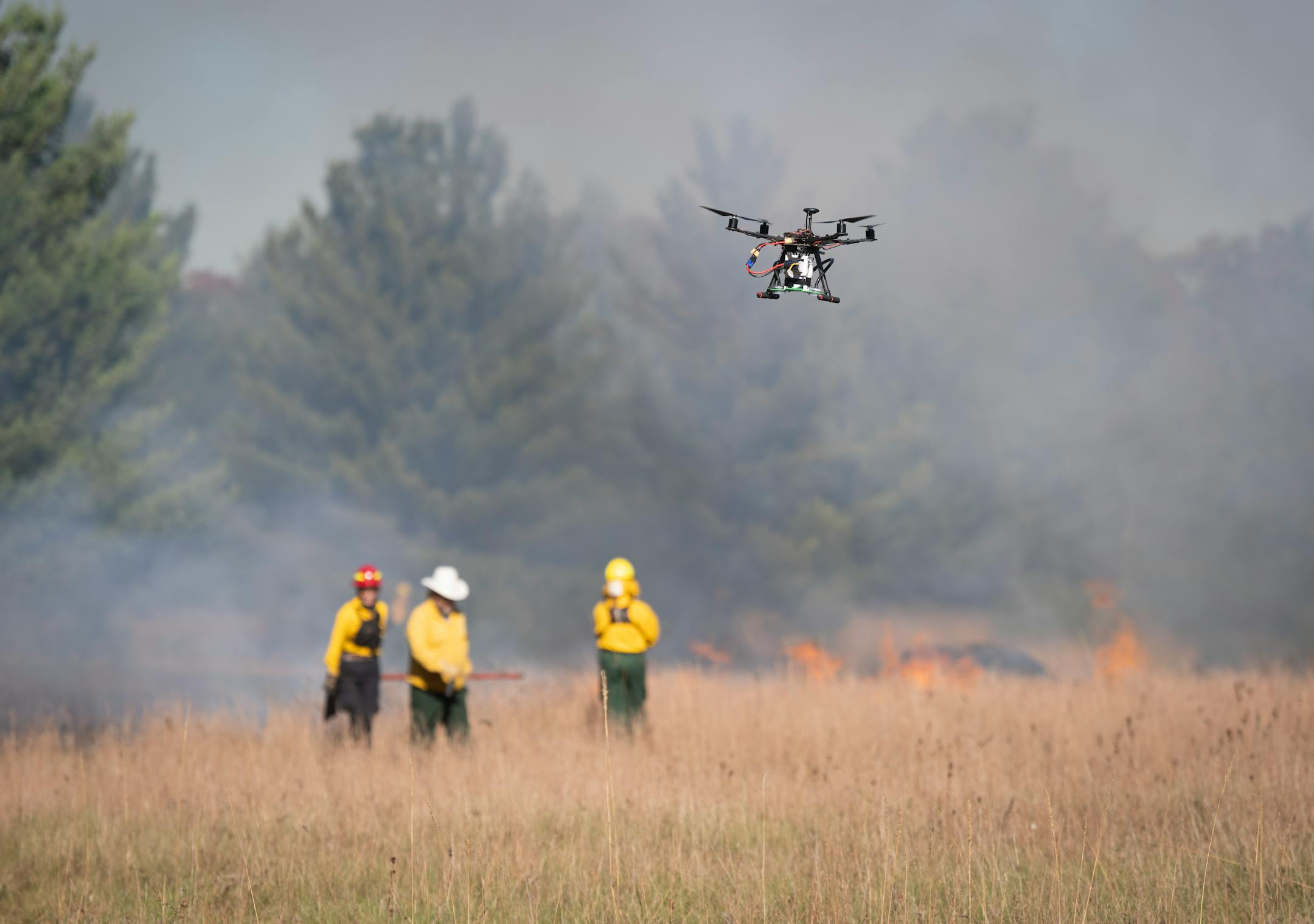 Plumes of smoke drifted up from a fire steadily taking over a 30-acre prairie at Cedar Creek Ecosystem Science Reserve, north of the Twin Cities. Amid the haze, five black drones zipped around.