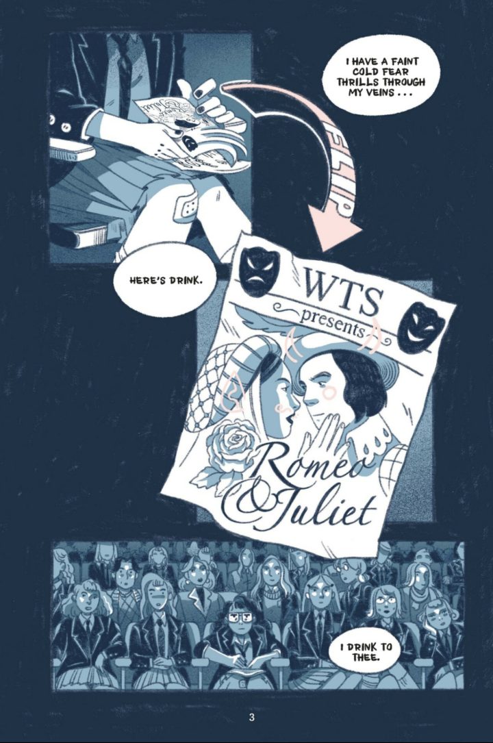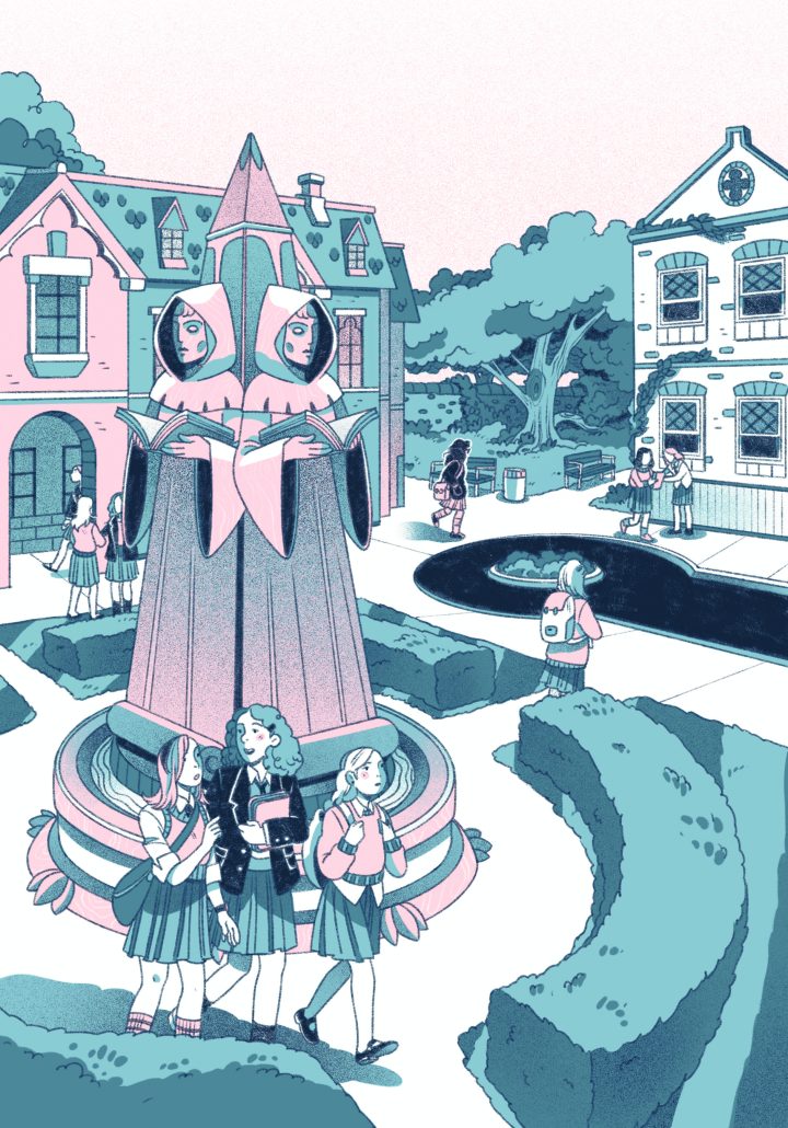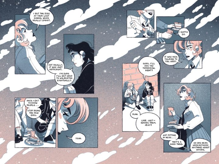 As Nicole said, it’s like we set it in the 80s, and then we proceeded to set it in an all-girls private school in the 80s, so we didn’t get to do any of the cool clothes that would actually be 80s clothes. But I do think that Nicole perfectly captured the colors and the sort of vibe of that setting in these pages.