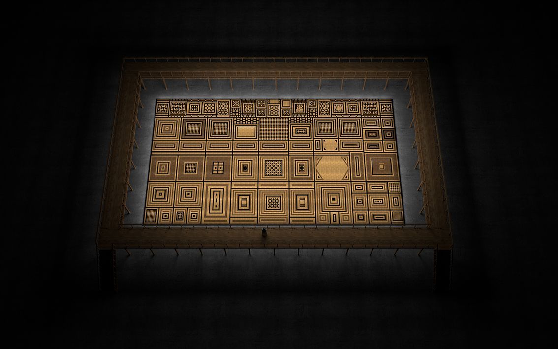 Standing by the ruins (2025) was the second work of this type that she has made; at the first Diriyah Biennale, in Riyadh in 2021, she re-staged the tiled pattern of the Grand Mosque of Aleppo, which suffered extensive damage in the Syrian Civil War. For both pieces, Awartani worked with traditional mud-brick makers in Saudi Arabia, asking them to omit the hay that typically binds the bricks together so that cracks form throughout the pattern, emphasising the vulnerability of the sites.