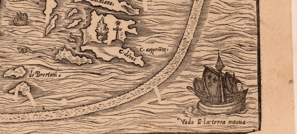 “I go to Terra Nova!” Detail, 1606 edition of 1556 map of Terra Nova by Giacomo Gastaldi. Courtesy of the John Carter Brown Library.