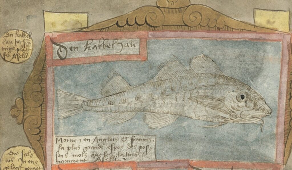 “Den kabbeljau” (Codfish) in Adriaen Coenen’s Visboek (Fish book), written in the 1570s. Courtesy of the World Digital Library.