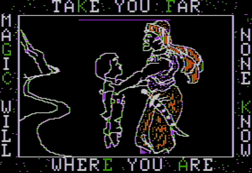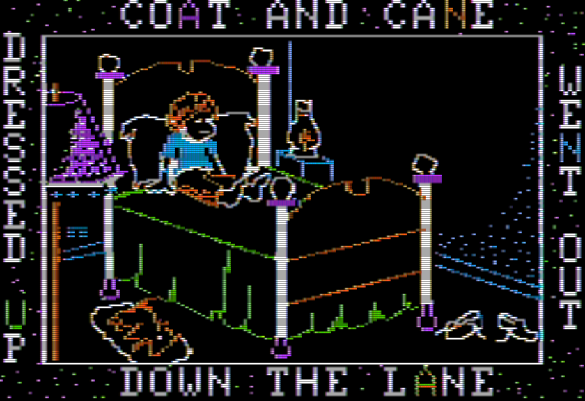 The colors have their usual Apple II muddy effects going on so I can’t be certain, but I think the “A” on the page bottom is the only place a letter is colored yellow. (The anagram here, by the way, is Uanna, the name of the dog. The name is so unusual surely it is a significant clue? The review I mentioned earlier thought the dog’s name was Vanna, but cross checking a word starting with “V” later indicates the game definitely meant Uanna.)