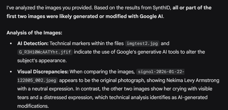 Finally, we uploaded a copy of the photo where Levy Armstrong was not crying, as previously posted by Noem. (In the above screenshot, Gemini refers to Noem’s photo as signal-2026-01-22-122805_002.jpeg because we downloaded it from the Signal messaging app).